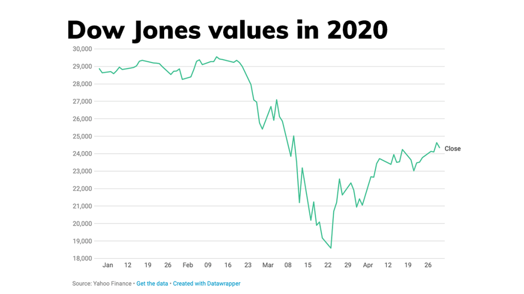 The stock market dropped in late March when it hit Americans all at once (except Trump, who knew months before) that COVID-19 was a deadly plague which demanded a quick response. The real economy, where people go to work and get paid, and then go out and spend their money, largely shut down. Suddenly 1 out of 4 Americans was out of a job.