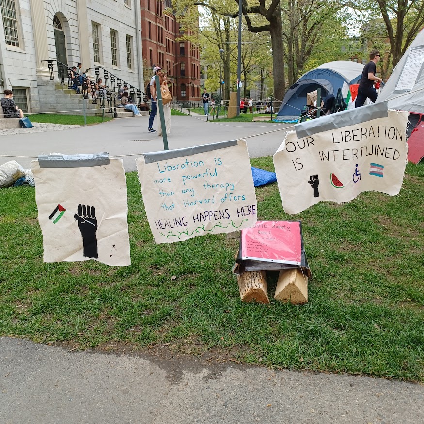The mood in the camp is much more tense than when I visited last week. Vague threats have been exchanged between the Administration and the protesters. Few campers are available to speak with the (Harvard-affiliated) public; most sit in a circle in the middle of the tents, deep in conversation for hours.