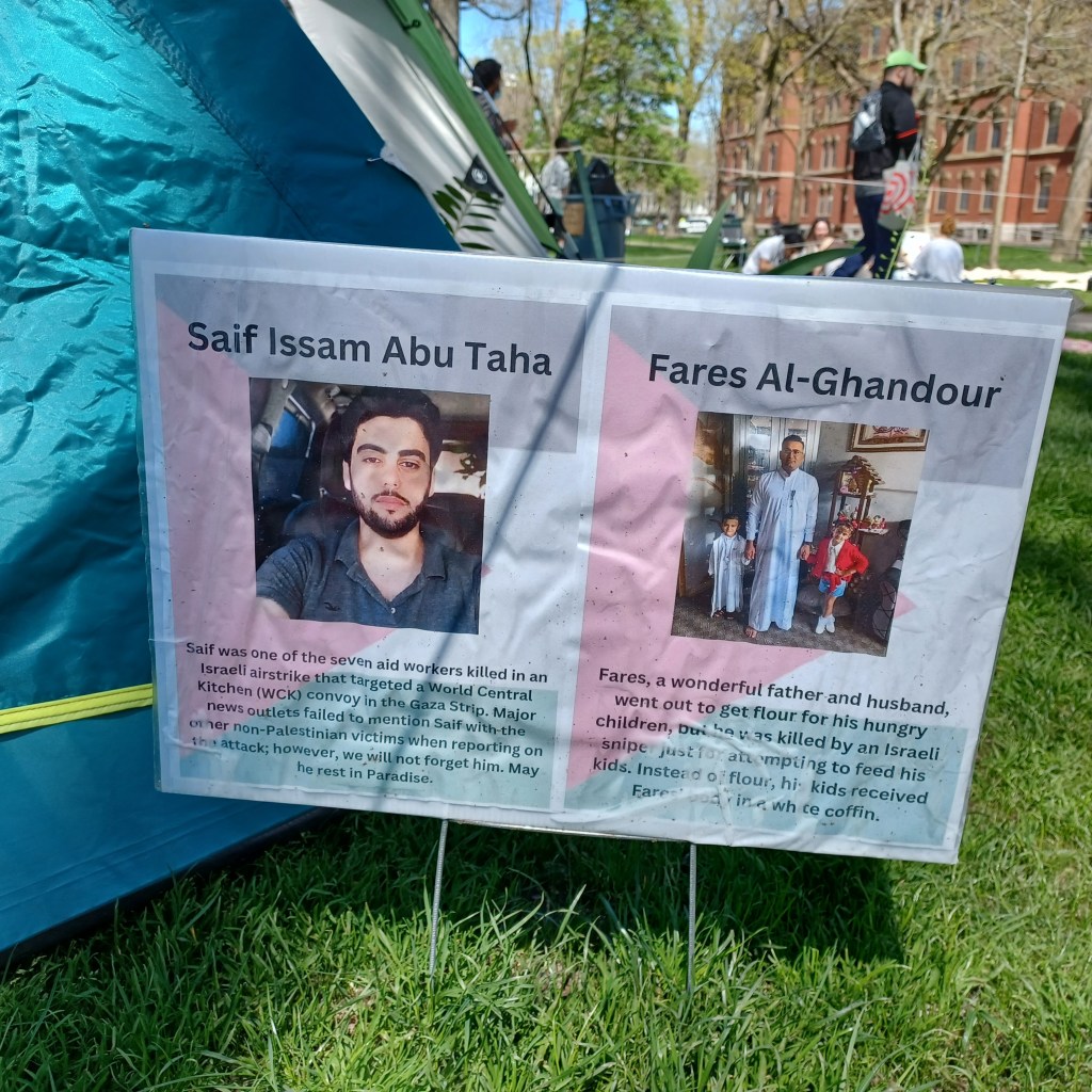 I walk the perimeter of the encampment with M, a small woman in a headscarf. I ask her if the camp would like more alumni to show up as protection, liaisons, or just moral support. She texts the organizers, but says she thinks they would appreciate it.