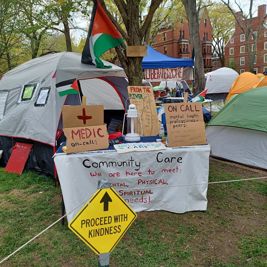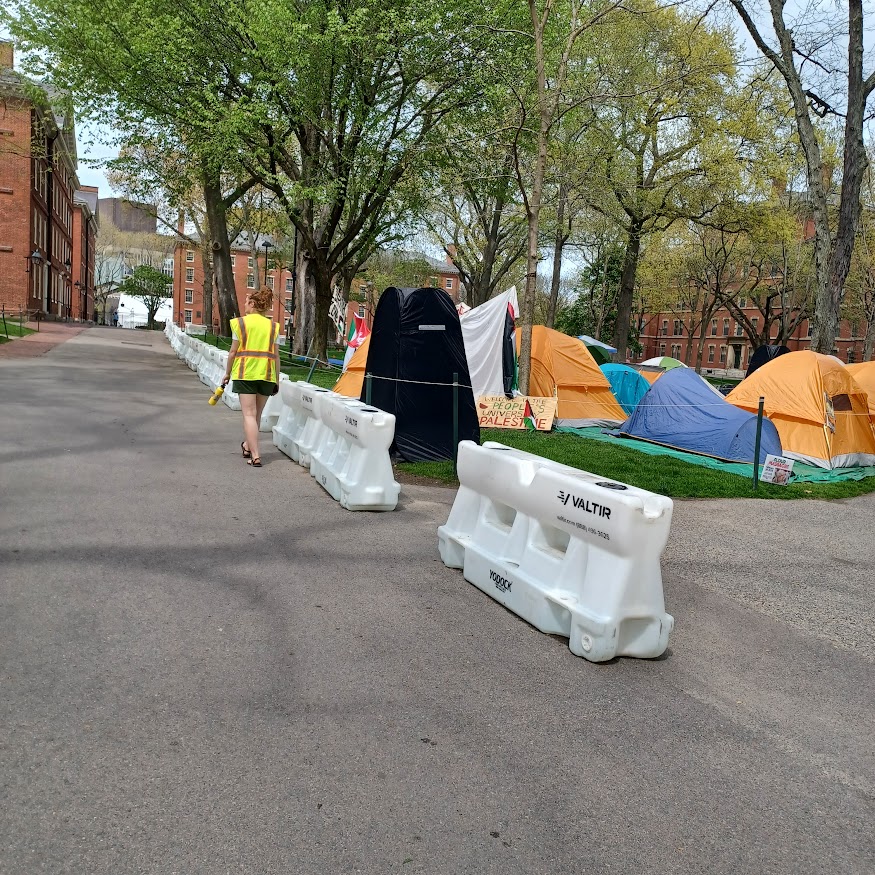 I leave the camp while a camp spokesperson is still addressing the press. I hear they will not take questions. Outside the gate, some policemen are hanging around. Asked if they’re Harvard police, they say, “No, we’re not as cool, but we try.” One mishears me and thinks I said something about ice cream. Another says that might help the situation, if everybody got some. I say, Good idea, let’s have a party and just talk! They laugh and tell me to stay safe.