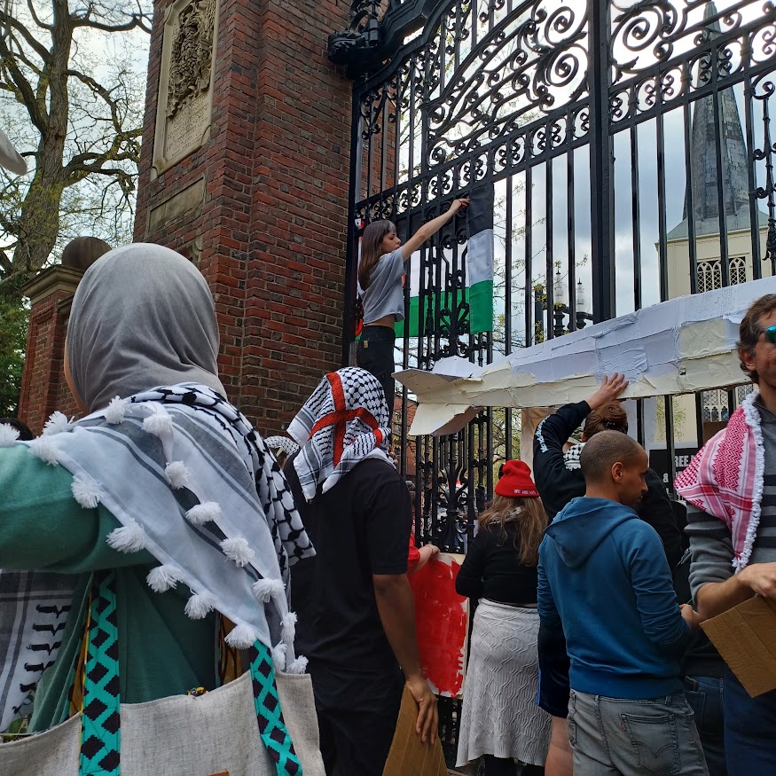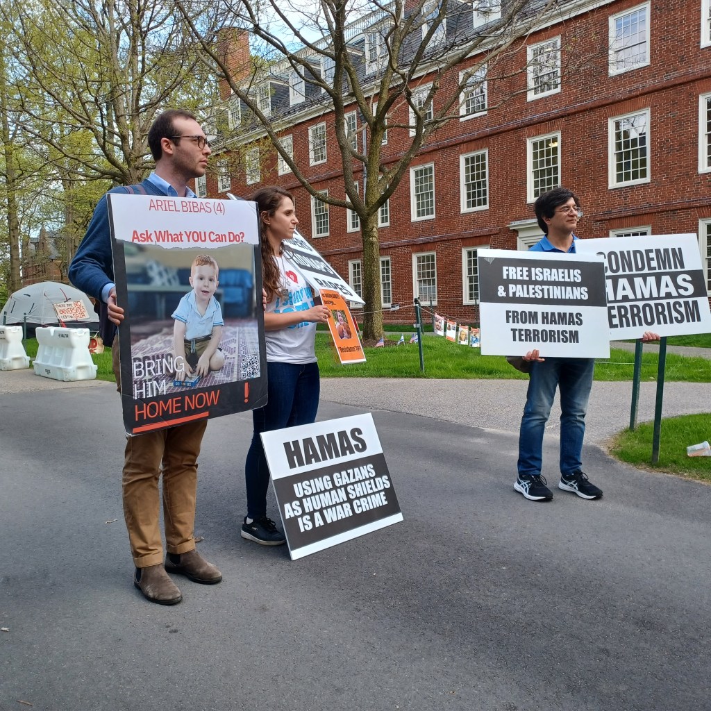 When the pro-Palestinian protesters arrive, there is some jostling while the counter protesters try to hold their signs in front. Nobody goes as far as actual shoving. I see people trying to be courteous about sharing the space. A papermache missile that must be eight feet long reading “Paid for by Harvard” gets held over my head, with apologies. One girl stands on a guy’s shoulders and leans against the iron railings to hold up her Free Palestine sign.