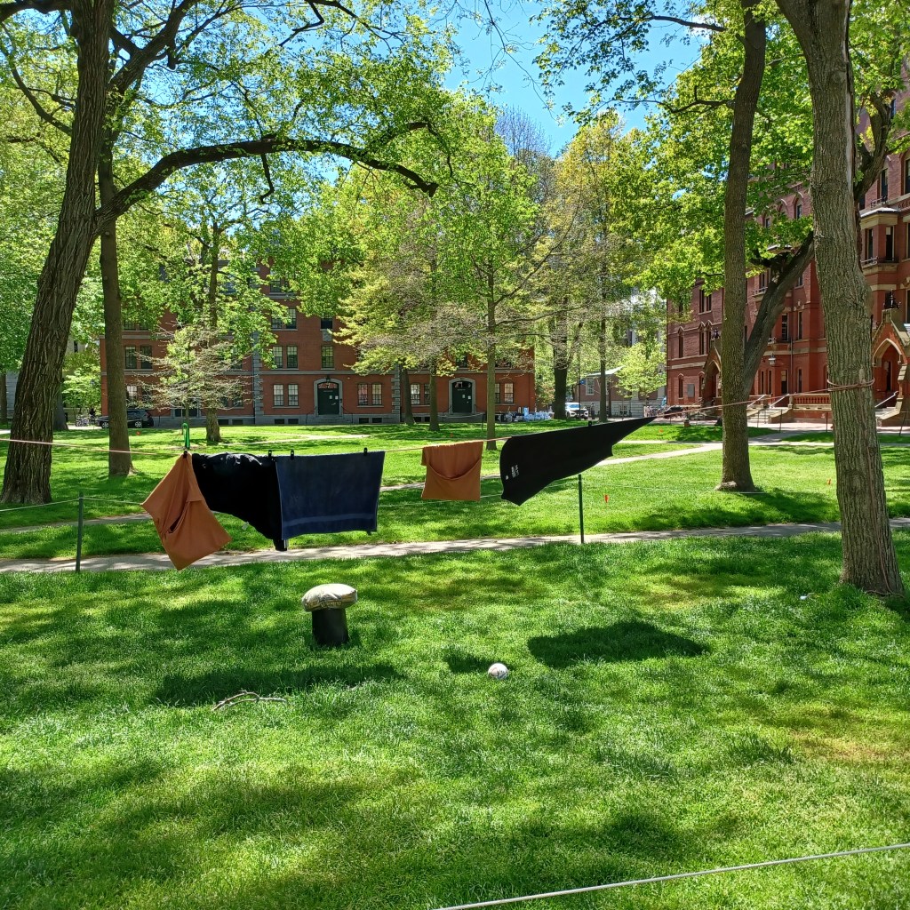 Yesterday, Mother’s Day Sunday, was the last move-out date for freshmen. Now the campus is eerily quiet. The only noise comes from riding lawn mowers, and a supporter of the protest – not obliged to follow its policies – who is standing outside the gates with a megaphone, shouting Free, free Palestine! He calls out the University for its complicity in war, fossil fuels, and Big Pharma. Spread out on the lawns near Johnston Gate are at least five very long scrolls of canvas with the names of the dead in Gaza.