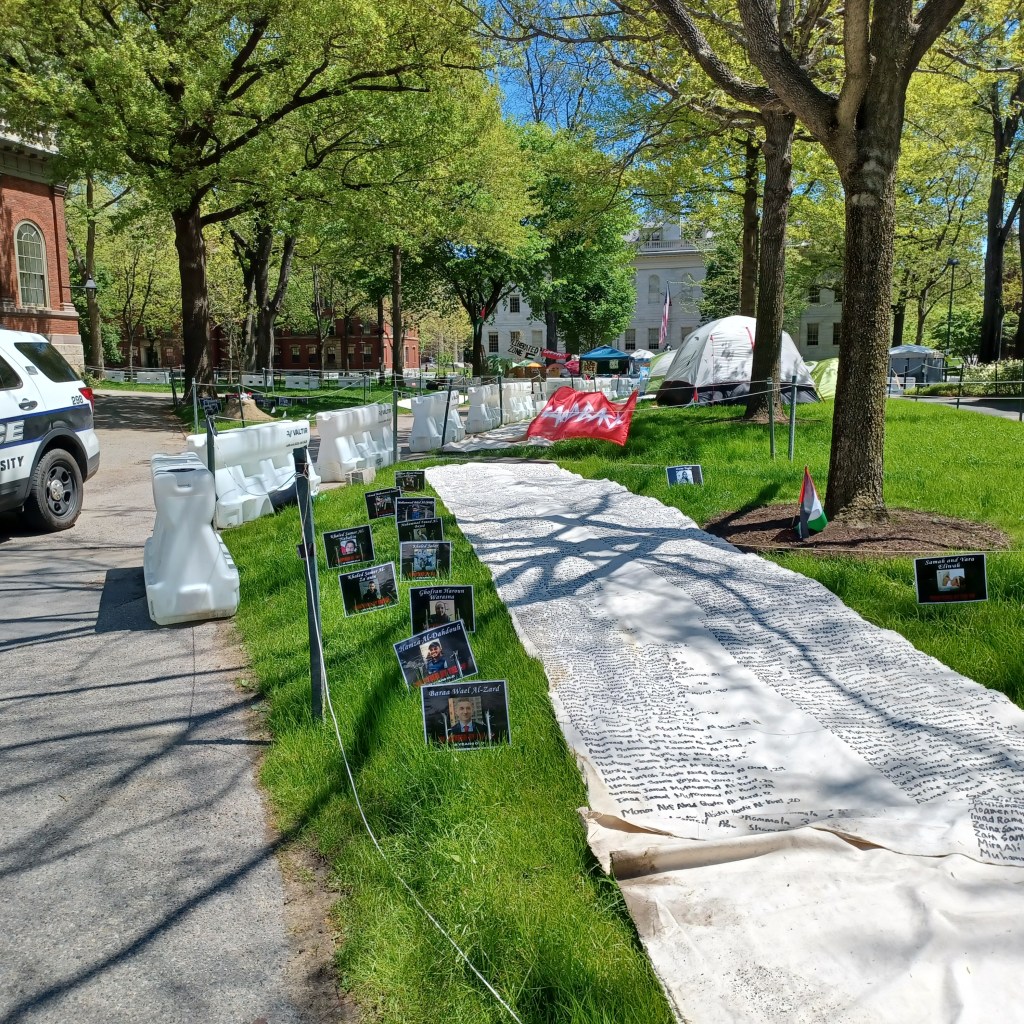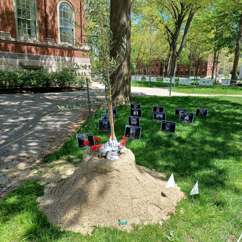 The protesters have planted an olive tree outside Harvard Hall, surrounded by placards bearing photos of people killed in Gaza, their names and ages, and the phrase “Martyred by the IDF” (Israeli Defense Forces). The placards bearing photos, names, and ages of people martyred in the October 7 Hamas attack that were in this area last week are no longer in view.